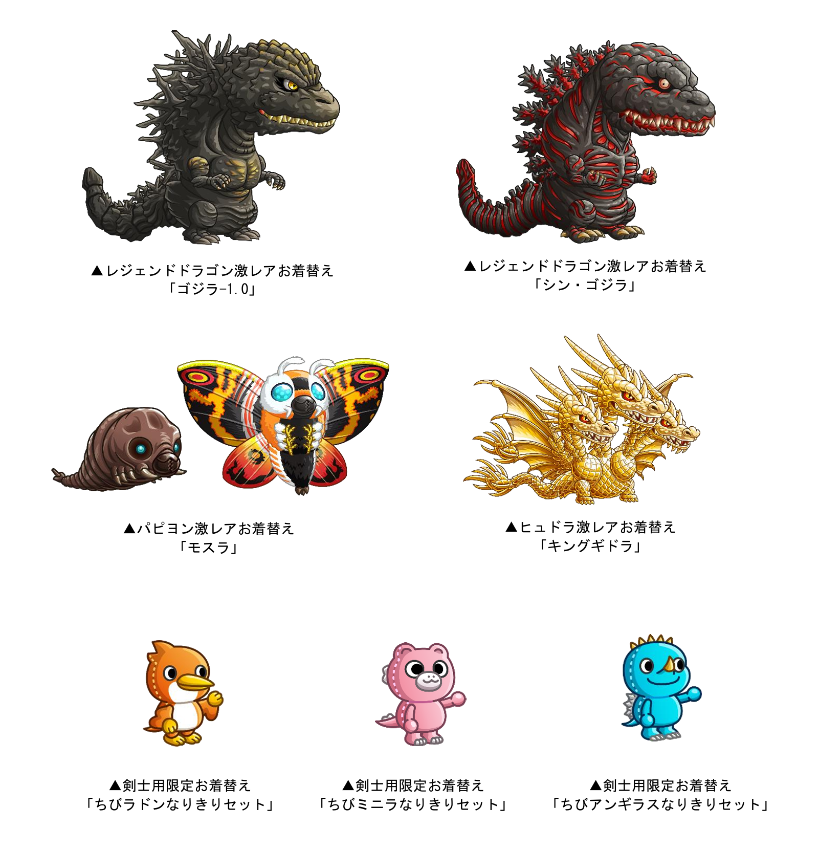 さらにコラボ限定の激レアお着替え「ゴジラ-1.0」「シン・ゴジラ」「モスラ」「キングギドラ」剣士用コラボ限定お着替え「ちびラドンなりきりセット」「ちびアンギラスなりきりセット」も復刻登場いたします。アバたまを割って、コラボ期間中にしか手に入らないお着替えを手に入れましょう!