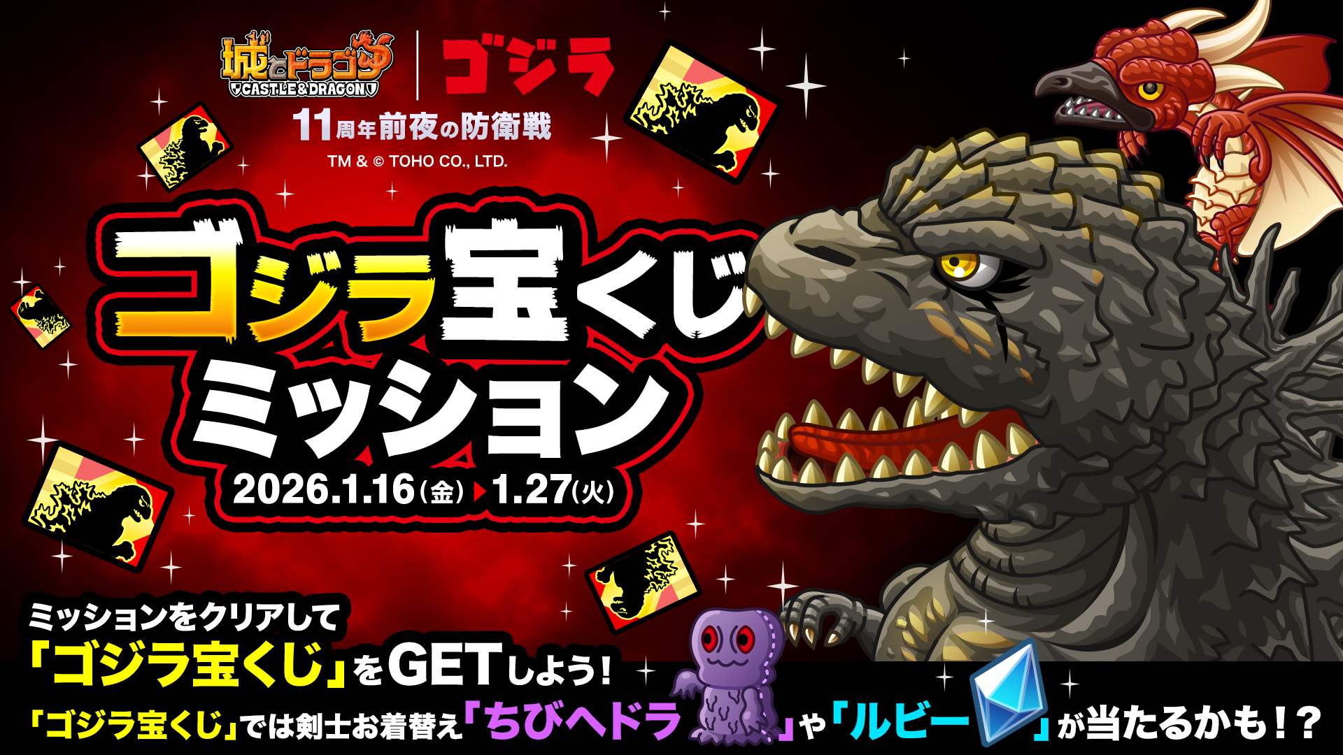 また、『城とドラゴン』11周年間近の本イベントでは、剣士用お着替え「ちびへドラなりきりセット」や1等100,000ルビーなどが当たる「ゴジラ宝くじ」も開催!宝くじの結果は生配信で行いますのでお見逃しなく!