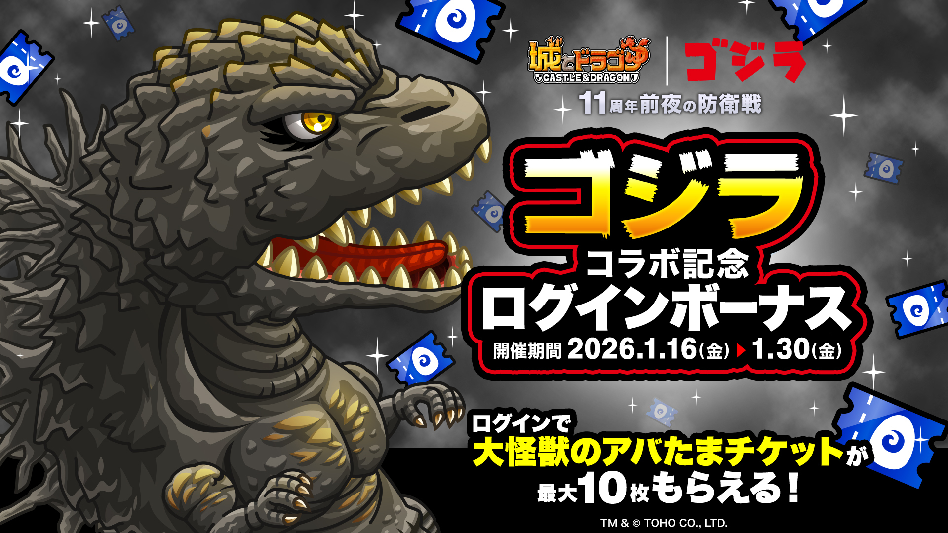 株式会社アソビズム(本社:東京都千代田区、代表取締役:大手智之)は、App Store・Google Playにて好評配信中の『城とドラゴン』で、『ゴジラ』との復刻コラボイベントを2026年1月16日(金)より開催いたします。