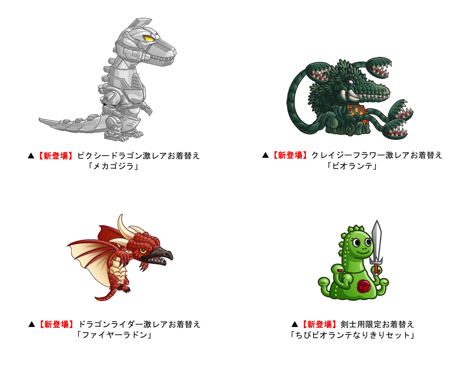 ピクシードラゴン(メカゴジラ)、クレイジーフラワー(ビオランテ)、ドラゴンライダー(ファイヤーラドン)、レジェンドドラゴン(シン・ゴジラ、ゴジラ-1.0)、パピヨン(モスラ)、ヒュドラ(キングギドラ)