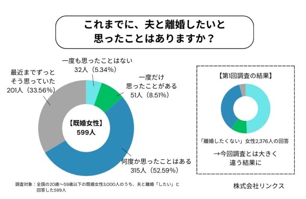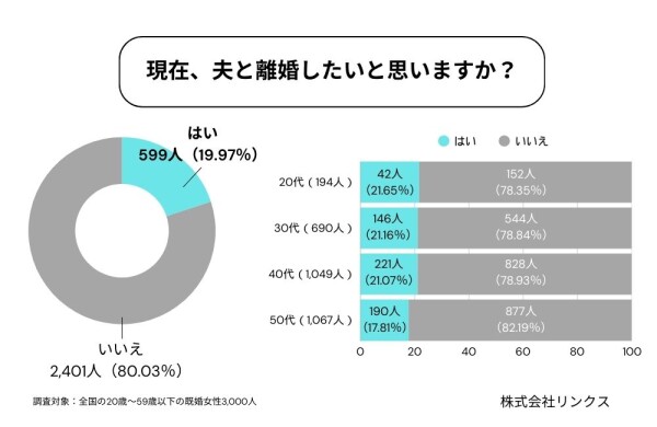 株式会社リンクス(東京都港区)は、マッチングアプリ「既婚者クラブ」ユーザーを対象に、全国の既婚女性3,000人を中心に「夫との離婚に関する意識調査」を実施しました。