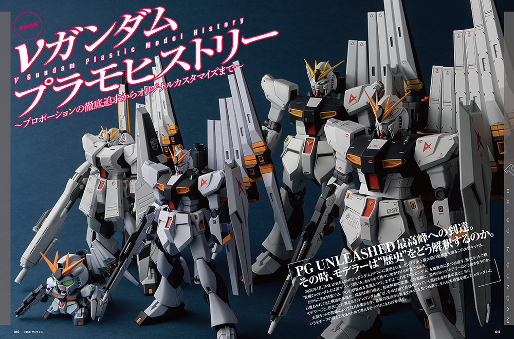 2026年1月、大注目のアイテム「PG UNLEASHED νガンダム」がいよいよ発売となります。本号ではこの超大型アイテムの素組みレビューを最速でお届けしつつ、巻頭特集として「歴代νガンダムキットの徹底製作」を敢行します。