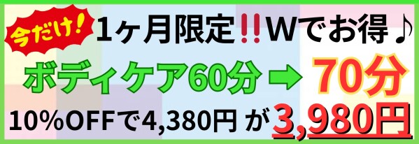 ボディケア60分→70分が「10%OFF」のご案内しております