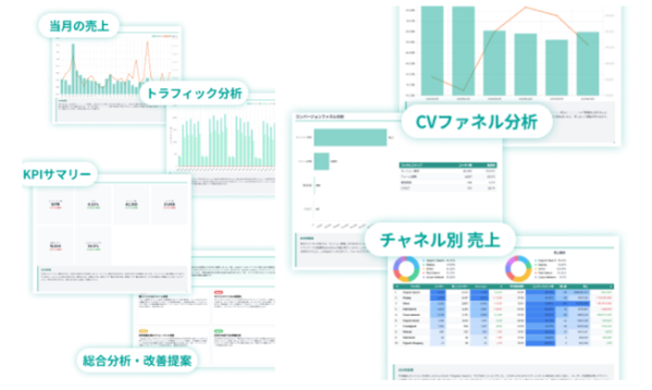 ・KPI サマリー・AI 分析サマリー:月次のトラフィックやコンバージョン率などの重要指標を端的に要約。