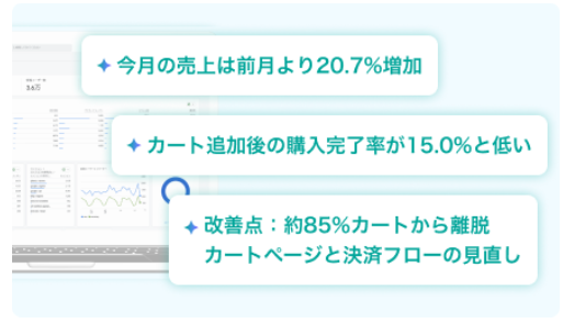 膨大な GA4データの中から、分析に必要な数字の収集と要点整理を AI が自動化。専門スキルや時間を要するデータの精査工程をスキップし、数分で現状を把握できます。