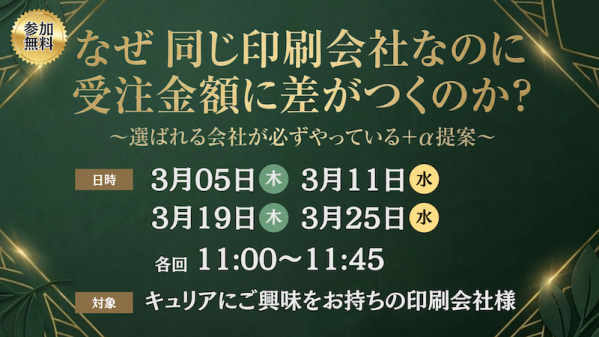 CEO:樋口 清政)は、2026年3月に印刷業界向けに、なぜ 同じ印刷会社なのに受注金額に差がつくのか? 〜選ばれる会社が必ずやっている+α提案〜 と題して、セミナーを開催することをお知らせいたします。