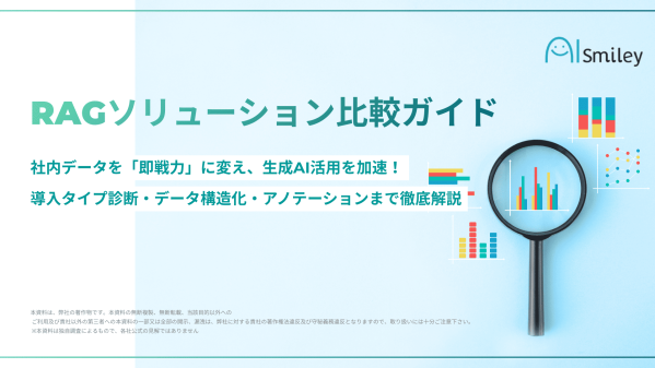 そこでAIsmileyは、これからRAG導入を検討する多くの企業が失敗しないよう、ソリューション選定からデータ整備の手順までを網羅した『RAGソリューション比較ガイド』を作成しました。