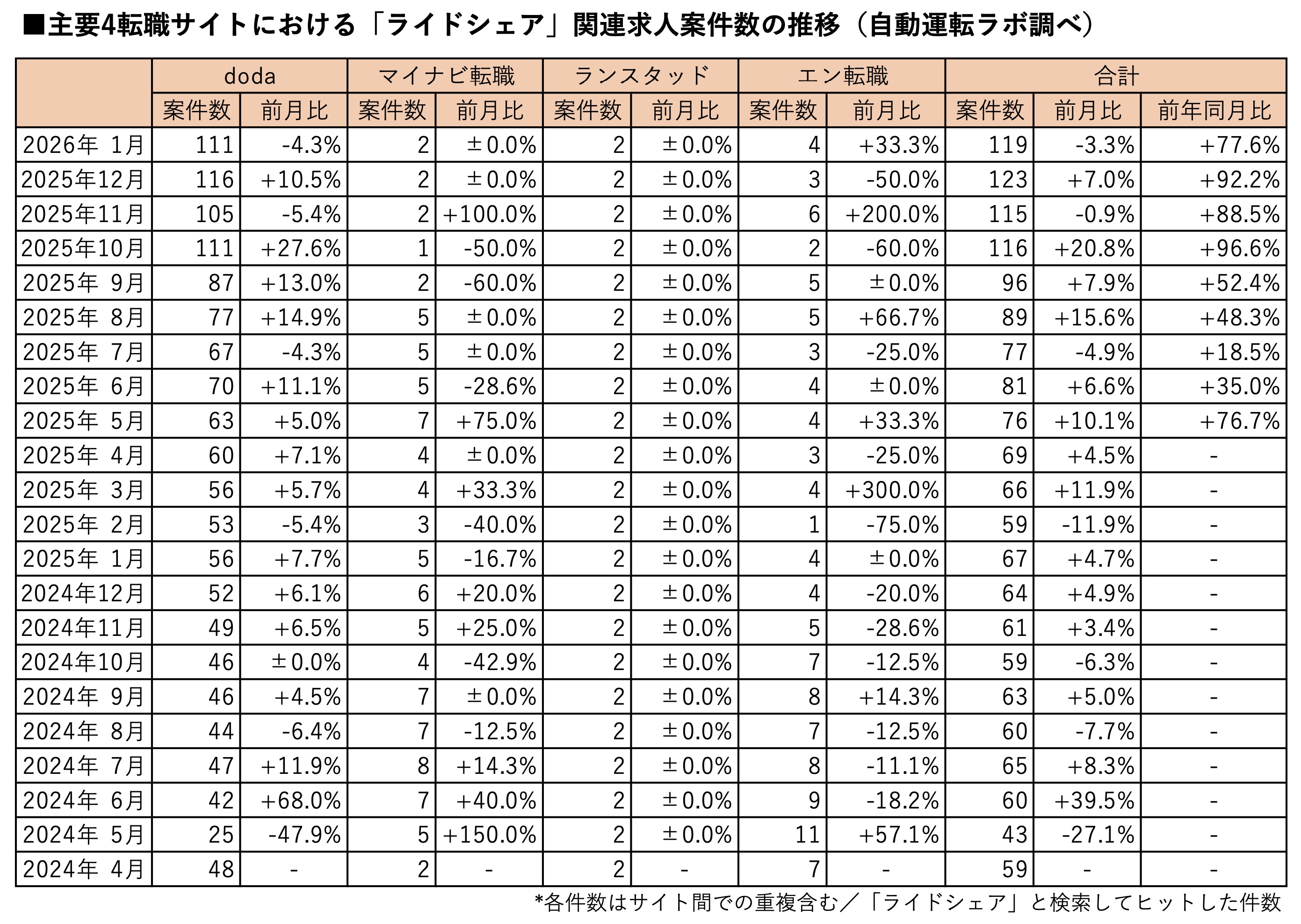 株式会社ストロボ(以下、当社/東京都港区 代表取締役 下山哲平)が運営するニュースメディア『自動運転ラボ』(https://jidounten-lab.com)は、ライドシェア関連求人案件数の最新調査(2026年1月末時点)をまとめましたので、結果を発表いたします。