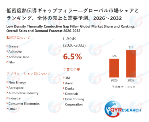 2026年2月9日に、QYResearch株式会社は「低密度熱伝導ギャップフィラー―グローバル市場シェアとランキング、全体の売上と需要予測、2026~2032」の調査レポートを発表しました。本報告書は、低密度熱伝導ギャップフィラーの世界市場に関する売上、販売量、価格、市場シェア、主要企業のランキングなどを網羅し、地域別、国別、製品タイプ別、用途別に詳細に分析しています。また、低密度熱伝導ギャップフィラーの市場規模を、2021年から2032年までの市場パターンに基づき、将来の市場動向を予測しています。本調査は、定量的データとともに、企業が成長戦略を策定し、競争環境を評価し、市場ポジションを分析するための定性的分析も提供しています。