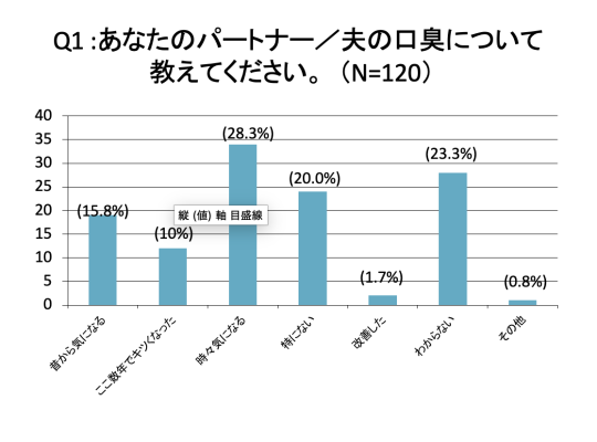 「あなたのパートナー/夫の口臭について教えてください。」の問いに、一番多かったのは「時々口臭が気になる」で28.3%でした。「昔から口臭が気になっている」(15.8%)、「ここ数年で口臭がキツくなった/気になるようになった」(10%)を加えると全体の54.2%の妻が、夫の口臭を認識していることがわかりました。