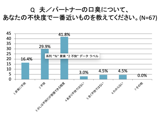 また、夫の口臭が気になっている67名を対象に「夫/パートナーの口臭について、あなたの不快度で一番近いものを教えてください。」と聞いたところ、41.8%の人が「少しは不快だが我慢できる程度」と回答し、「非常に不快」(16.4%)と「不快」(29.9%)を合わせると88.1%の妻が夫の口臭に不快感を感じていることが明らかになりました。