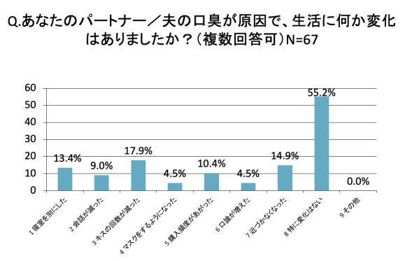 「あなたのパートナー/夫の口臭が原因で、生活に何か変化はありましたか?(複数回答可)」の問いに対して、55%は「特に変化はない」と回答しました。しかし、残りの45%には、大きな変化があることがわかりました。一番多かったのが「キスの回数が減った」で17.9%、次に「近づかなくなった」が14.9%、「寝室を別にした」13.4%と続きました。口臭が夫婦仲を悪くしていることがあきらかになりました。