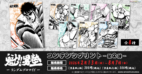 株式会社インクルーズ(東京都渋谷区、代表取締役社長 山﨑 健司)は、2月13日(金)より、日本全国のコンビニエンスストア店内のマルチコピー機を中心に、気軽にプリントできる「インクルーズプリント by eプリントサービス」にて、『魁!!男塾』のイラストを使用したランダムブロマイド第2弾が販売開始したことをご報告させていただきます。
