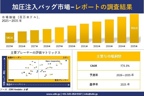 SDKI Analytics(本社:東京都渋谷区)は、このたび、2026年02月02に「加圧注入バッグ市場調査レポート:2026-2035年の市場規模、シェア、傾向の予測」を発表しました。加圧注入バッグに関する市場調査レポートには、統計的および分析的アプローチを使用した予測評価が含まれています。この調査レポートでは、一次および二次調査方法を使用して分析された主要な業界洞察を通じて将来の傾向を理解できるようにすることで、主要な市場動向を読者に説明しています。