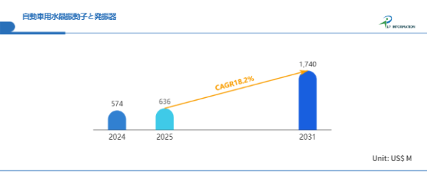 LP Information調査チームの最新レポートである「世界自動車用水晶振動子と発振器市場の成長予測2025~2031」(https://www.lpinformation.jp/reports/315730/automotive-quartz-crystal-and-oscillator)によると、2025年から2031年の予測期間中のCAGRが18.2%で、2031年までにグローバル自動車用水晶振動子と発振器市場規模は17.4億米ドルに達すると予測されている。