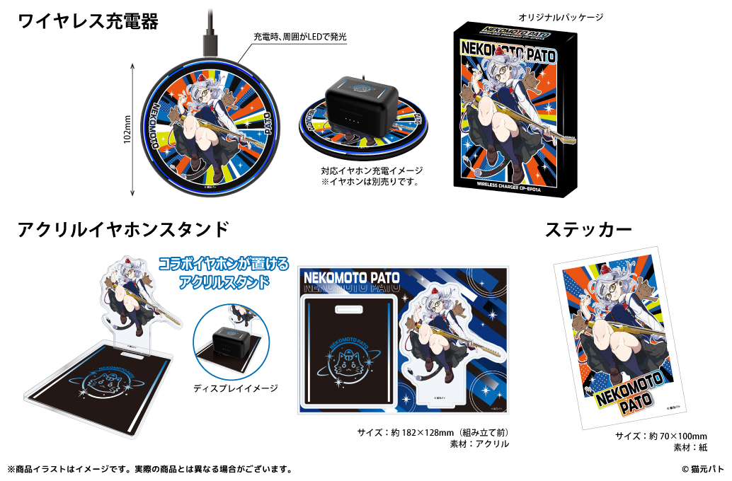 あわせて、撮り下ろしビジュアルの「ワイヤレス充電器(1種類)」「アクリルイヤホンスタンド(1種類)」「ステッカー(1種類)」も販売いたします。
