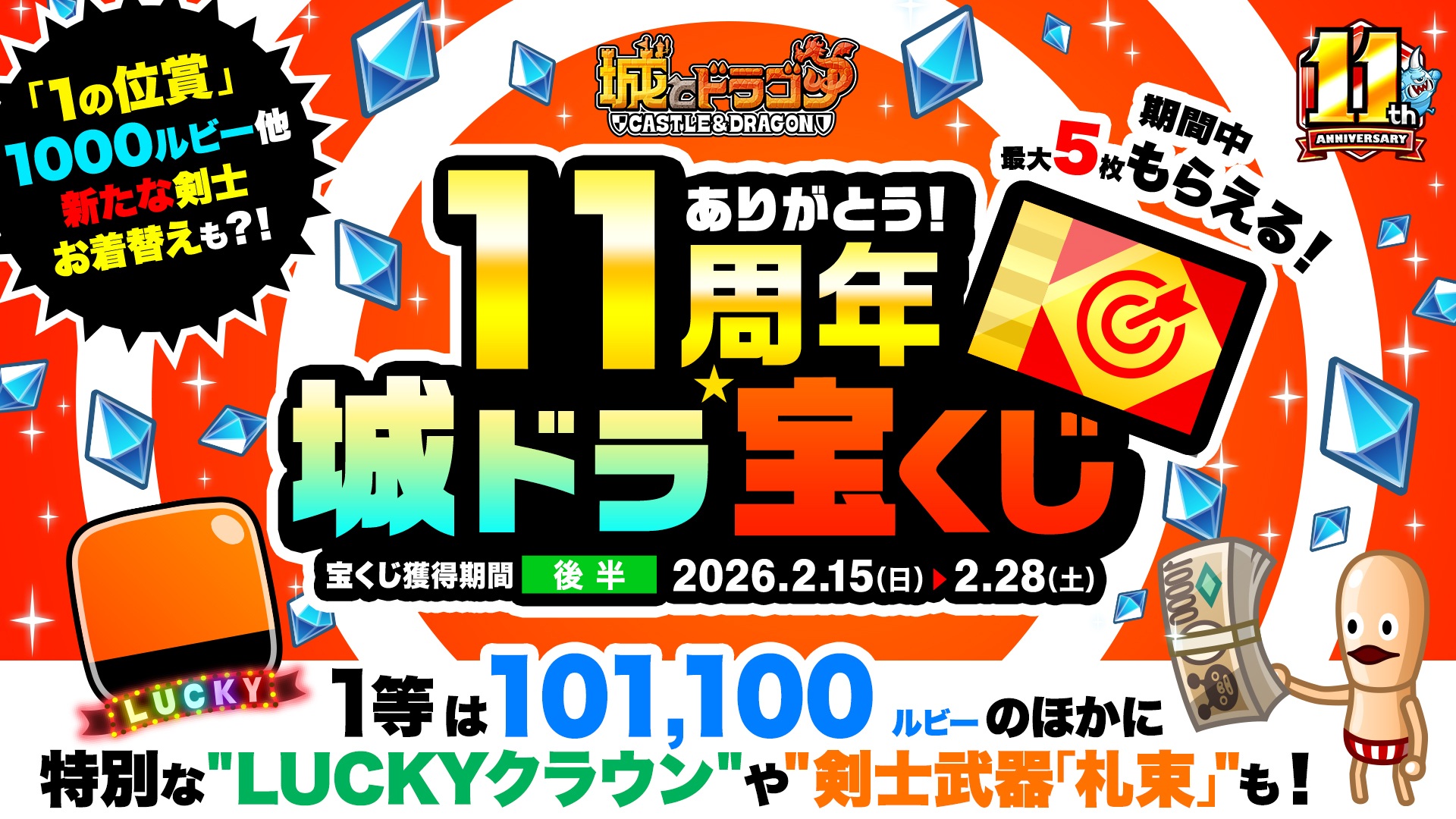 城ドラ最強運試し!「ありがとう11周年☆城ドラ宝くじ」が登場!1等で最高101,100ルビーが当たるほか、特別な“LUCKYクラウン”や、剣士の限定武器“札束”を。また、1の位賞当選者には1,000ルビーに加え、新・限定剣士お着替えを進呈!一部の当選が発表されるくじの抽選は、3月上旬の城ドラ公式YouTube生配信にて実施予定です。
