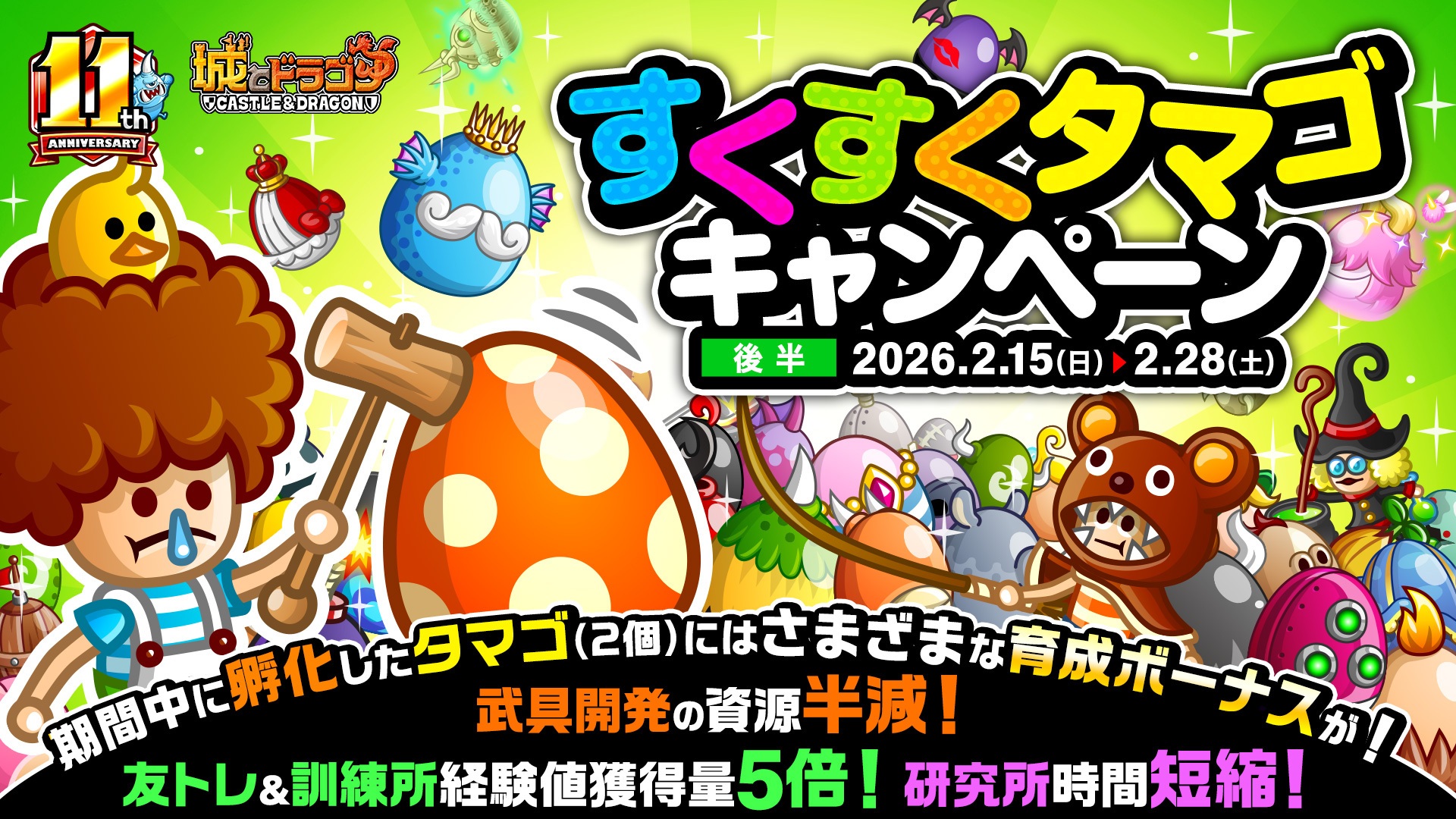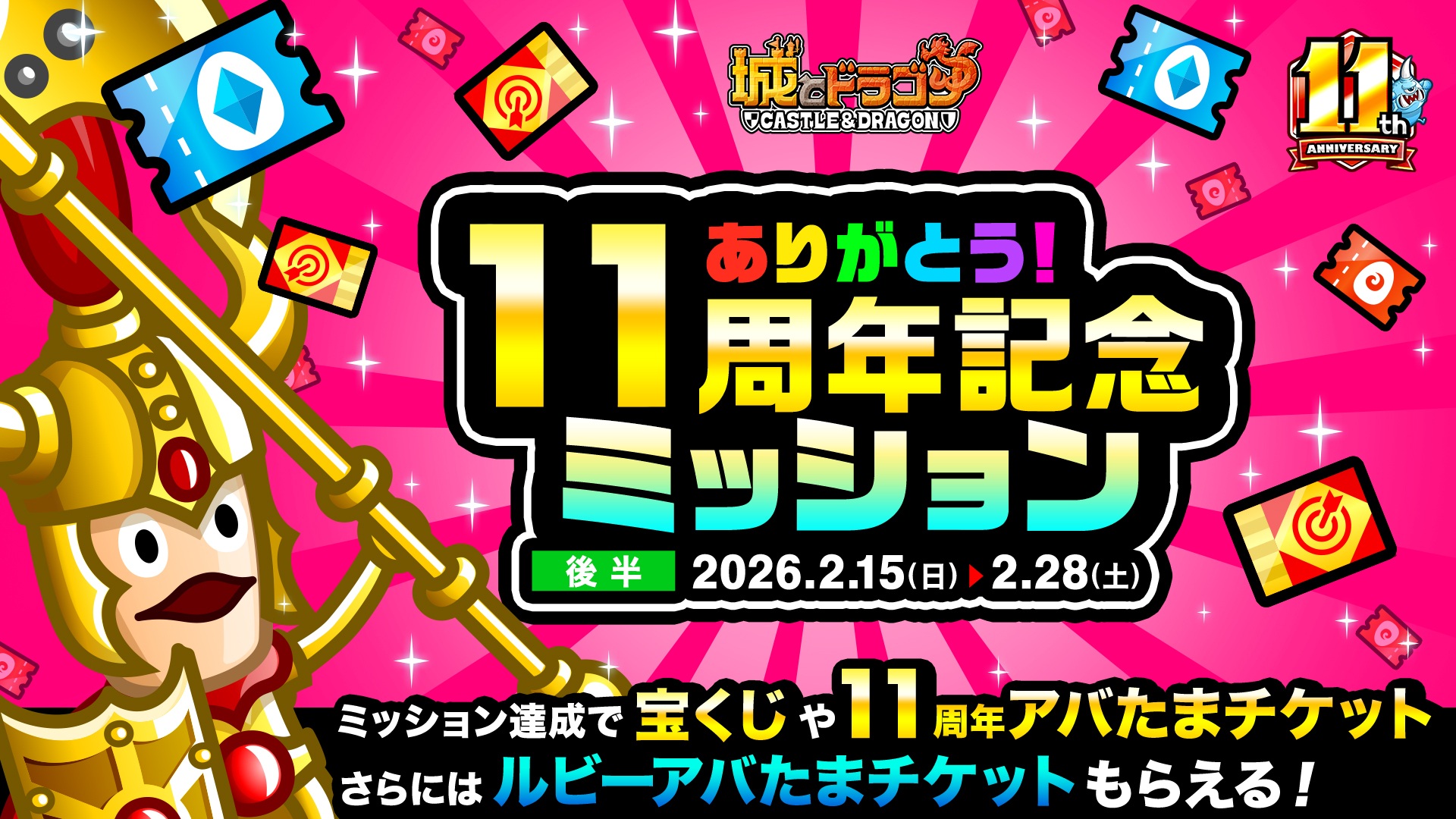 現在開催中の『城とドラゴン』11周年記念キャンペーン「ありがとう11周年!城ドラ超感謝祭(後半)」を、2月15日(日)0時より開催中です。特別なログインボーナスやミッションはもちろん、1日1回最大“11,100ルビー”が当たる!?「11周年ルビーアバたま」、最高“101,100ルビー”などが当たる「城ドラ宝くじ」、さらに「運営オススメキャラ育成キャンペーン」など内容盛りだくさん。後半も『城とドラゴン』のお祭りをぜひお楽しみください!