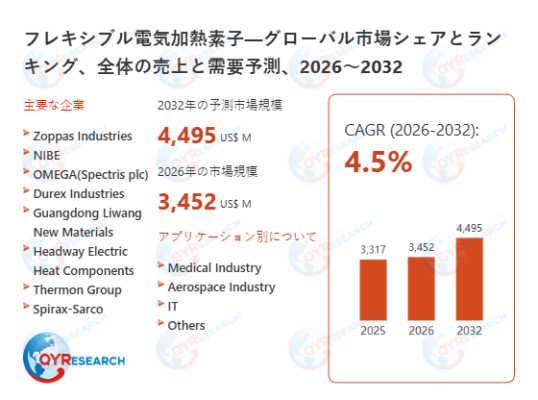 2026年2月14日に、QYResearch株式会社(所在地:東京都中央区)は「フレキシブル電気加熱素子―グローバル市場シェアとランキング、全体の売上と需要予測、2026~2032」の最新調査資料を発行しました。本レポートでは、世界のフレキシブル電気加熱素子市場規模、市場動向、成長予測を詳細に分析し、今後の市場の変化と発展方向を見通します。フレキシブル電気加熱素子市場を製品別、用途別、地域別に分類し、各セグメントにおける売上、市場シェア、成長トレンドを明確にします。主要企業の紹介、売上、最新の開発状況、および競合環境に関する詳細な分析を提供します。また、市場成長を促進する主な要因と業界が直面する課題を分析し、将来の市場機会を予測しています。