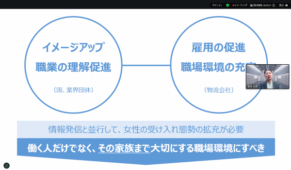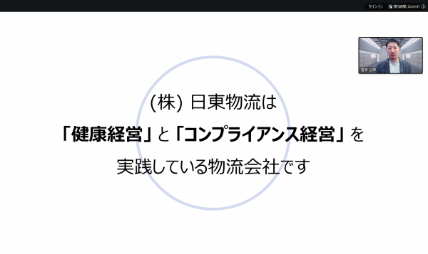 冷凍・チルド帯の食品を中心とした運送事業を展開する株式会社日東物流(本社:千葉県四街道市、代表取締役:菅原拓也)は、厚生労働省の推進する「女性の活躍推進および両立支援に関する総合的情報提供事業」の一環として、2月10日(火)に開催された新卒就職者向けのオンラインイベント「仕事とくらしのリアルトーク ~自分らしい働き方を見つけよう!~」に、当社代表の菅原が登壇、当社の取り組みについてお話しいたしました。