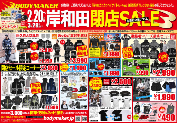 行っているBODYMAKER株式会社(本社:大阪府吹田市垂水町3-16-17 代表:長淵 翔)よりお知らせです。感謝感激!ご愛顧いただきましたボディメーカー岸和田カンカンベイサイドモール店は、施設契約満了にともない閉店の運びとなりました。(3月29日(日)完全閉店)ボディメーカー岸和田カンカンベイサイドモール店では、日頃のご愛顧に対する感謝の気持ちを込めて、2月20日(金)より「岸和田閉店SALE」をスタートします。