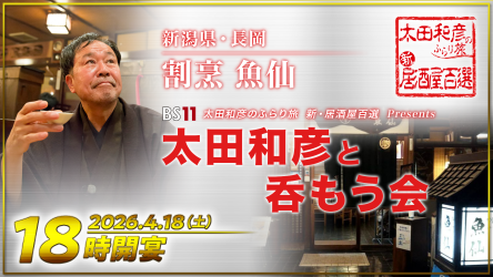 本イベントは、現在好評放送中の『太田和彦のふらり旅 新・居酒屋百選』(毎週日曜日よる9時00分)に出演の居酒屋探訪家・太田和彦さんが、過去に番組で訪れた居酒屋を会場に、参加者と一緒に地域のお酒や地元食材を使った料理を楽しむ特別イベントです。第1回の会場は新潟県・長岡の老舗「割烹 魚仙」。大正時代から続く名店が、今回のイベントのために新潟県の地酒数百種類と、地元食材を中心に旬の魚や野菜を使った郷土料理をご用意します。また、「Maison Aoi(メゾンアオイ)」を醸す長岡の酒蔵「葵酒造」の青木里沙社長との酒蔵トークや、プレゼント抽選会も開催予定。