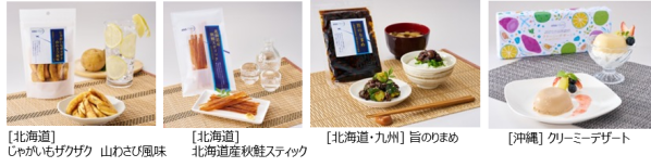 『ANA FINDS』のグルメは、旅先で出会えるその土地のおいしい食材をつかった4商品を新たにラインナップしました。真空フライ製法によりザクザク食感が楽しめる「じゃがいもザクザク」に新味の山わさび風味が登場。ほんのり甘みのある天然秋鮭をスティック状にした「北海道産秋鮭スティック」、有明海の板海苔を佃煮にして北海道産の大豆を混ぜ込んだ「旨のりまめ」はご飯のお供に最適。「クリーミーデザート」はクリームチーズをベースに、沖縄産紅芋のやさしい味と、シークヮーサーの酸味と香りをプラスしたさっぱりした味の2つを楽しめる彩り豊かなスイーツです。