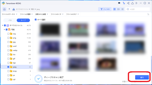 種類別の選択肢の中から、復元したいタイプを選択して「スキャン」をクリック。今回は例として「写真」のみとします。