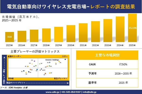 SDKI Analytics(本社:東京都渋谷区)は、このたび、2026年02月18に「電気自動車向けワイヤレス充電市場調査レポート:2026-2035年の市場規模、シェア、傾向の予測」を発表しました。電気自動車向けワイヤレス充電に関する市場調査レポートには、統計的および分析的アプローチを使用した予測評価が含まれています。この調査レポートでは、一次および二次調査方法を使用して分析された主要な業界洞察を通じて将来の傾向を理解できるようにすることで、主要な市場動向を読者に説明しています。