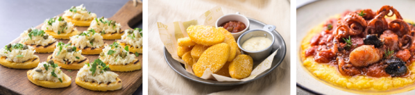 本来、弱火で約40分も練り続ける必要があるポレンタの調理工程を工場で完結し、厨房のオペレーションを大幅に簡略化することが可能となりました。現場ではフライパンやグリルで焼いて前菜やビュッフェメニューに使用したり、フライヤーで揚げてフィンガーフードにしたり、凍ったまま水を加えて5-6分加熱して伝統的な付け合わせにも使えるなど、本品だけで多彩なメニュー展開ができます。