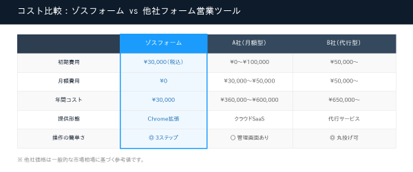 多くのフォーム営業ツールは月額3万〜5万円のサブスクリプション型で、年間30万〜60万円のコストが発生します。ゾスフォームは30,000円の買い切り型のため、一度のご購入でずっとお使いいただけます。追加の月額費用は一切かかりません。