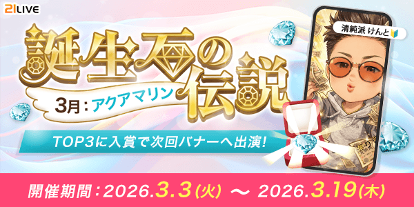 株式会社エムアンドティーティー(本社:沖縄県北谷町、代表取締役:井藤 三知子)が運営するエンターテイメント・ライブ配信アプリ【21LIVE(ニーイチライブ)】URL: https://21.live では、3月3日(火)より『誕生石の伝説』を開催します。