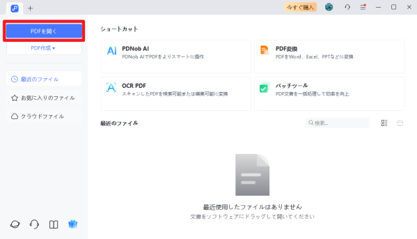 PCにPDNobをダウンロード・インストールします。起動後、「PDFを開く」をクリックし、編集したいPDFを選択します。