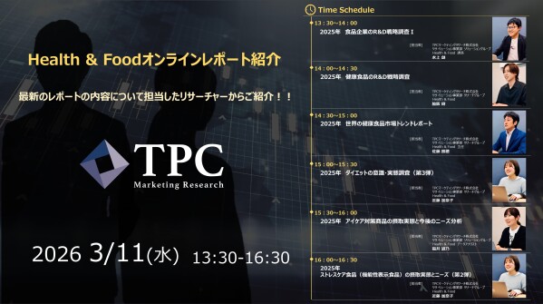 リサ・リューション事業を展開するTPCマーケティングリサーチ株式会社(代表取締役社長:松本 竜馬)は、2026年3月11日にHealth & Foodオンラインレポート紹介を開催いたします。