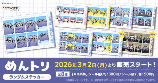 株式会社インクルーズ(東京都渋谷区、代表取締役社長 山﨑 健司)は、3月2日(月)より、日本全国のコンビニエンスストア店内のマルチコピー機を中心に、気軽にプリントできる「インクルーズプリント by eプリントサービス」にて、LINEスタンプ「面倒だがトリあえず返信」から生まれた株式会社インクルーズのオリジナルIP「めんトリ」のランダムステッカーが新規絵柄を追加して【再販】となりました事をご報告させていただきます。