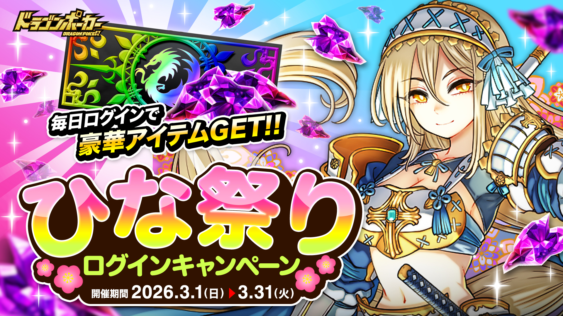 株式会社アソビズム(本社:東京都千代田区、代表取締役:大手智之)は、App Store・Google Playにて好評配信中のリアルタイム合体カードバトル『ドラゴンポーカー』で、2026年3月1日(日)より「ひな祭りログインキャンペーン」を開催することをお知らせいたします。