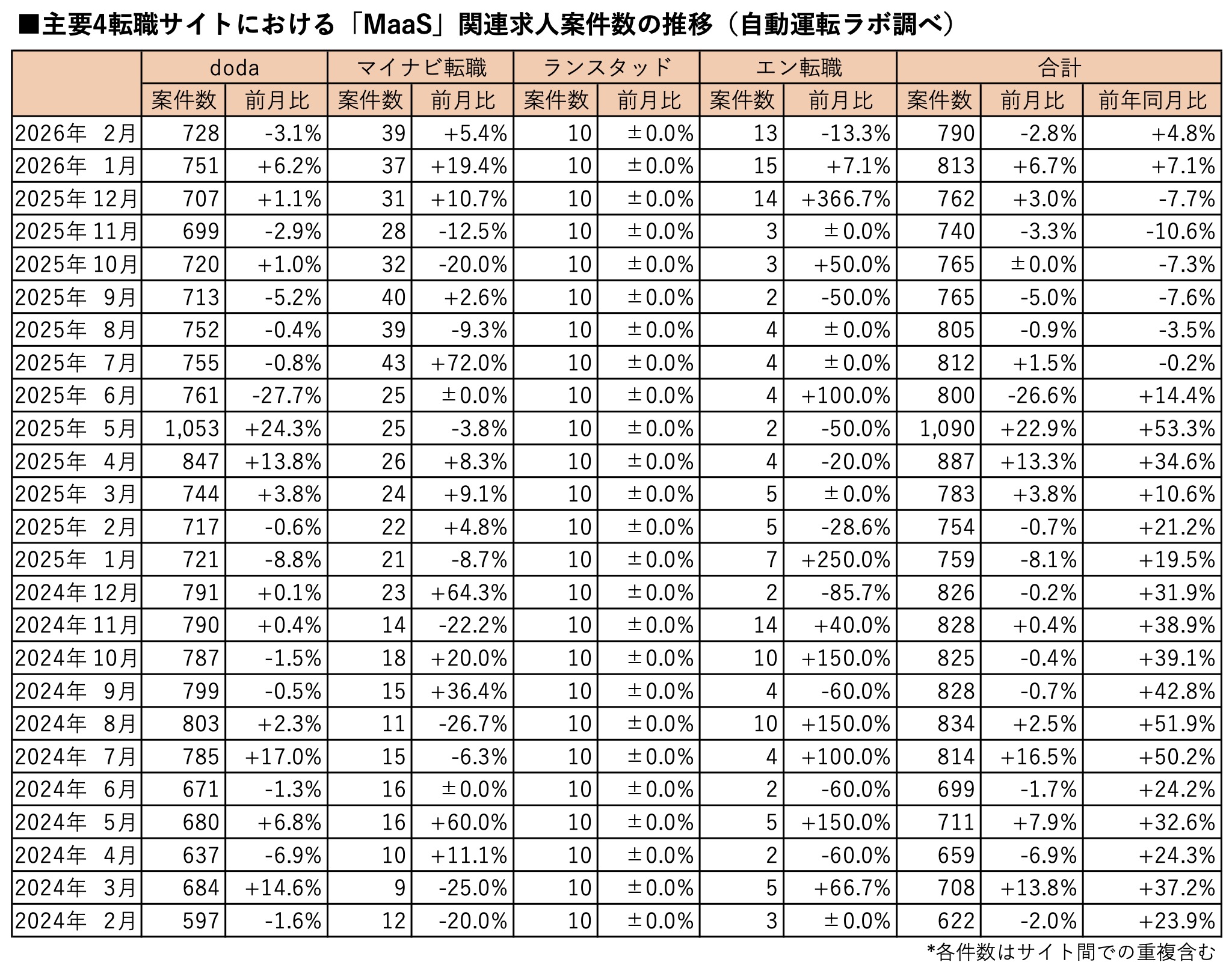 「MaaS」の関連求人案件数(主要転職4サイト)は、前月比2.8%減、前年同月比4.8%増の790件となりました。