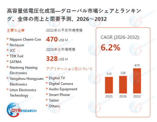 2026年3月2日に、QY Research株式会社(所在地:東京都中央区)は「高容量低電圧化成箔―グローバル市場シェアとランキング、全体の売上と需要予測、2026~2032」の最新調査資料を発行しました。本報告書では、世界の高容量低電圧化成箔市場の規模、動向及び成長予測を詳細に分析し、将来の市場変化と発展方向について展望しております。製品タイプ、応用分野及び地域別に高容量低電圧化成箔市場を分類し、各セグメントの売上高、市場シェア及び成長傾向を明確に提示しております。主要企業の概要、販売実績、最新の研究開発動向、競争環境について重点的に紹介するとともに、市場成長を推進する中核的要素と業界が直面する課題を分析し、これに基づき将来の市場機会を予測しております。