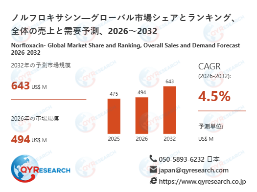 2026年3月2日に、QY Research株式会社(所在地:東京都中央区)は、「ノルフロキサシン―グローバル市場シェアとランキング、全体の売上と需要予測、2026~2032」の最新調査資料を公開しました。本レポートは、ノルフロキサシン市場の規模推移、成長トレンド、競争構造、地域動向、主要企業ランキングを体系的に整理し、市場全体の構造を明確化します。主要企業の市場シェアや競争戦略を軸に、売上、価格動向、需要予測データを分析し、現状把握と将来展望を提示します。2026~2032年の成長見通しを定量・定性の両面から検証し、企業の競争力強化と市場戦略高度化に資する実践的インサイトを提供します。