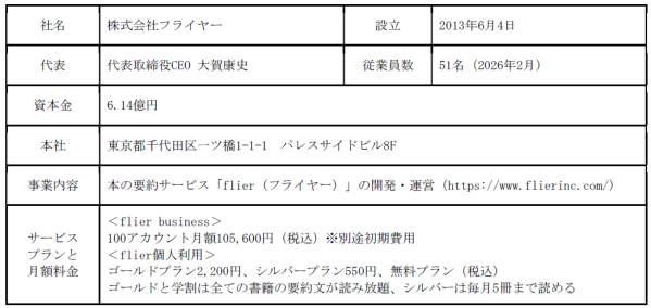 flierは、1冊10分で読める「本の要約サービス」です。ビジネス書の新刊や話題のベストセラー、名著の要約をウェブ、アプリで毎日公開。AIを使った音声版もあります。収録書籍数は4,200冊超、累計会員数は129万人、累計法人導入社数1,300社を突破しました(2026年2月現在)。