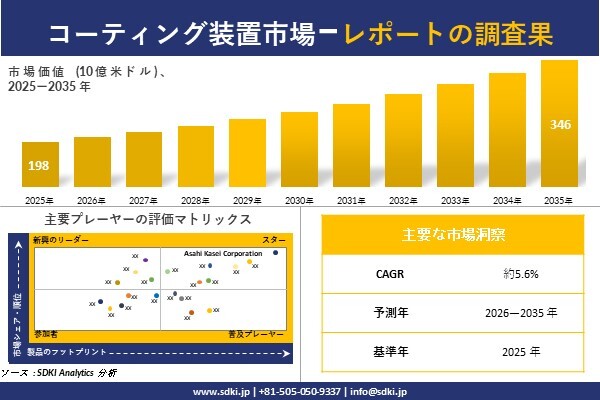 SDKI Analytics(本社:東京都渋谷区)は、このたび、2026年02月24に「コーティング装置市場調査レポート:2026-2035年の市場規模、シェア、傾向の予測」を発表しました。コーティング装置に関する市場調査レポートには、統計的および分析的アプローチを使用した予測評価が含まれています。この調査レポートでは、一次および二次調査方法を使用して分析された主要な業界洞察を通じて将来の傾向を理解できるようにすることで、主要な市場動向を読者に説明しています。