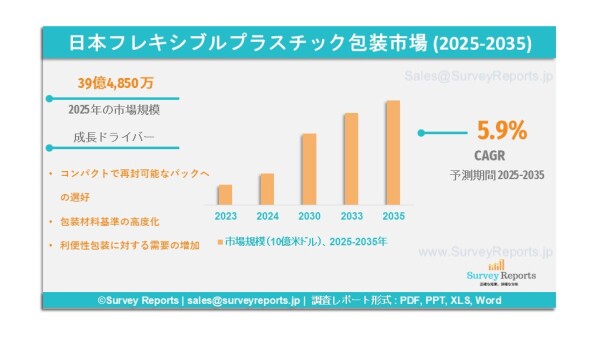 Survey Reports LLCは、2026年3月に「日本のフレキシブルプラスチック包装市場:製品タイプ別(フレキシブルバッグ、パウチ)、素材別(ポリエチレン〔PE〕、ポリプロピレン〔PP〕)、用途別(食品・飲料、パーソナルケアおよび化粧品)、クロージャータイプ別(ジッパー、スナップロック)、最終用途産業別(食品・飲料産業、ヘルスケア産業)―市場分析、動向、機会および予測(2025~2035年)」と題する調査報告書を2026年3月に発行したと発表した。本報告書は、日本のフレキシブルプラスチック包装市場に関する予測評価を提供するものである。また、同市場における成長要因、市場機会、課題および脅威を含む主要な市場ダイナミクスを強調している。