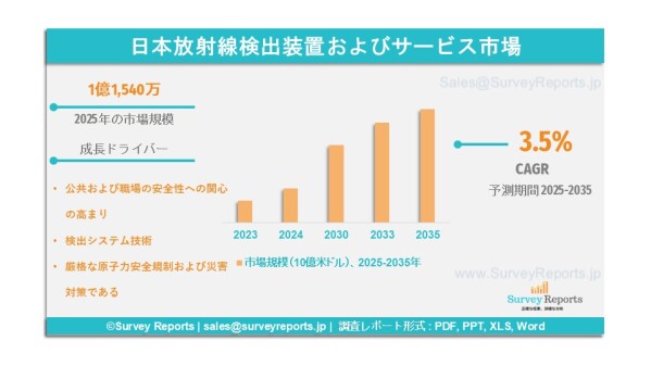 Survey Reports LLCは、2026年3月に「日本放射線検出装置およびサービス市場:製品別(個人線量計、環境放射線・表面汚染モニター、エリアプロセスモニター)、検出タイプ別(ガス封入型検出器、固体検出器、シンチレーター)―市場分析、動向、機会および予測(2025年~2035年)」と題する調査報告書を発行したと発表した。本報告書は、日本放射線検出装置およびサービス市場に関する予測評価を提供するものである。また、日本放射線検出装置およびサービス市場における成長要因、市場機会、課題および脅威を含む主要な市場ダイナミクスを強調しているものである。