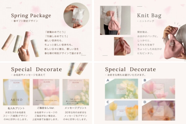 春限定デザインのスリーブは、4種類の柄をご用意しました。大切な方ににいちばん似合う柄をお選びいただき、その中に「お名前」または「メッセージ」を印字してお届けします。