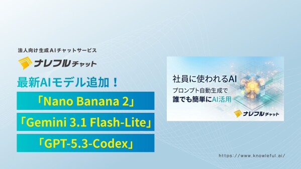 AIサービスやシステム開発を手掛けるCLINKS株式会社(本社:東京都中央区、代表取締役:河原浩介)が提供する法人向け生成AIチャットサービス「ナレフルチャット」は、2026年3月5日(木)、Googleの最新画像生成モデル「Nano Banana 2」と高速かつ軽量なテキスト生成モデル「Gemini 3.1 Flash-Lite」、OpenAIのコーディング特化モデル「GPT-5.3-Codex」を追加いたしました。本モデルの追加により、画像制作から開発業務、ちょっとした細かいタスクまでの幅広い業務の高速化を実現します。