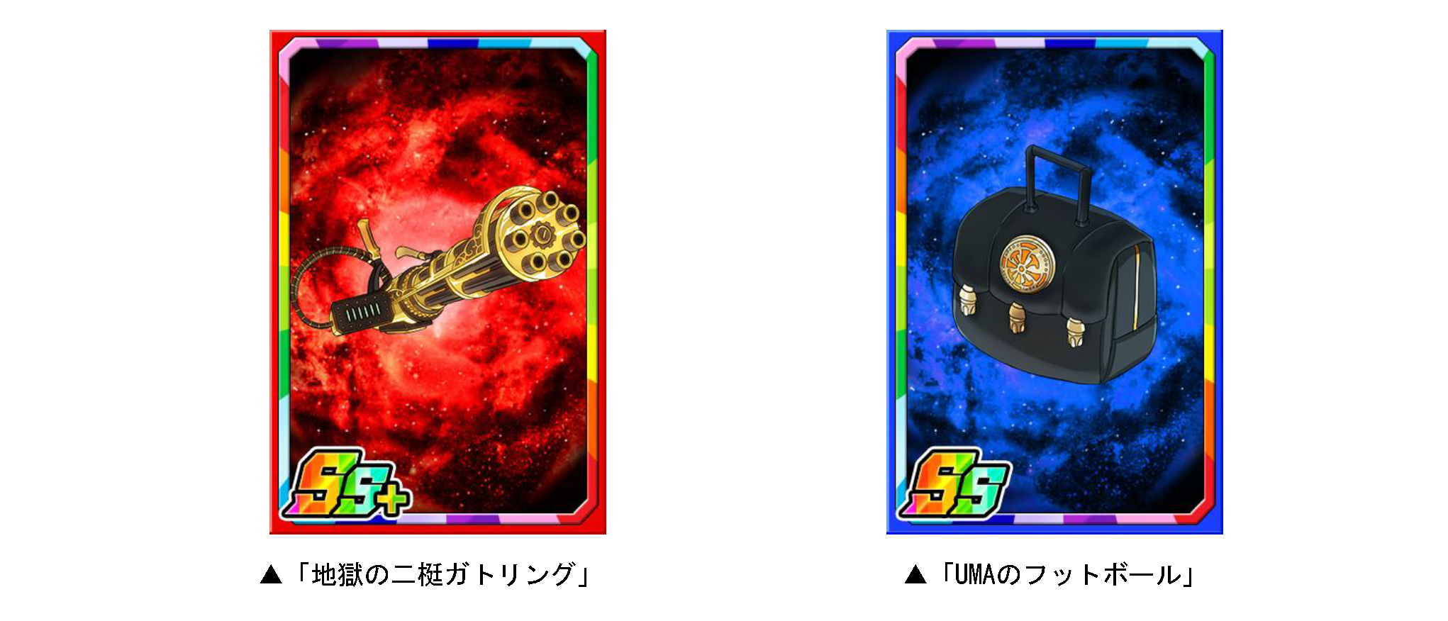ダンジョンのボスモンスターを倒すと、まれに新たな限定カード「地獄の二梃ガトリング」「UMAのフットボール」が手に入ります。このカードを複数枚集めると進化させることができ、子分スキルの効果が強力になります。