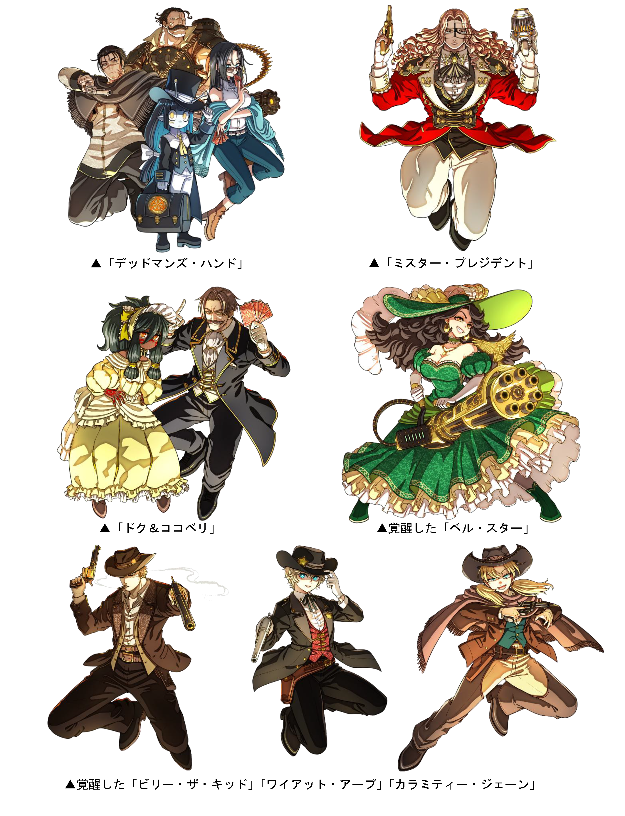 本ダンジョンには、新たに「デッドマンズ・ハンド」「ミスター・プレジデント」「ドク&ココペリ」、覚醒した「ビリー・ザ・キッド」「山賊女王ベル・スター」「ワイアット・アープ」「カラミティー・ジェーン」が登場!また、クリアした回数に応じて竜石を手に入れることができます。