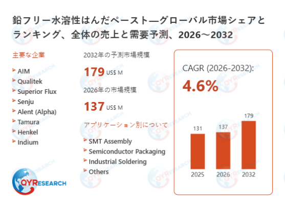 QY Research株式会社(所在地:東京都中央区)は、「鉛フリー水溶性はんだペースト―グローバル市場シェアとランキング、全体の売上と需要予測、2026~2032」に関する最新調査レポートを公開しました。本レポートでは、鉛フリー水溶性はんだペーストの世界市場を対象に、市場規模、販売数量、価格推移、市場シェア、主要企業の競争ポジションを体系的に整理し、地域別・国別の動向に加えて、製品タイプ別および用途別の詳細セグメント分析を掲載しています。さらに、2021年から2032年までのデータを基に市場の中長期的な成長軌道を検証し、将来的な拡大余地や投資機会を提示するとともに、競争環境の構造変化や企業戦略の方向性、業界が直面する課題についても多面的に考察しています。