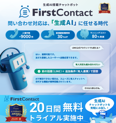 「FirstContact」は、AIとRAGを活用した高精度なチャットボットサービスです。企業ごとのナレッジを組み込んで最適な回答を生成し、FAQ対応や問い合わせ業務を効率化します。カスタマイズ性が高く、業種や用途に応じた最適な設定が可能です。AIsmiley AI PRODUCTS AWARDにおいて、チャットボット部門のグランプリを獲得した実績のあるサービスです。