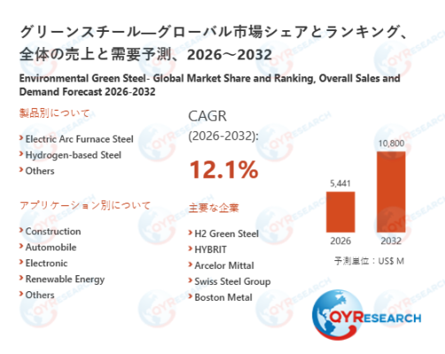QY Research株式会社(所在地:東京都中央区)は、「グリーンスチール―グローバル市場シェアとランキング、全体の売上と需要予測、2026~2032」に関する最新調査レポートを公開しました。本レポートでは、グリーンスチールの世界市場を対象に、市場規模、販売数量、価格推移、市場シェア、主要企業の競争ポジションを体系的に整理し、地域別・国別の動向に加えて、製品タイプ別および用途別の詳細セグメント分析を掲載しています。さらに、2021年から2032年までのデータを基に市場の中長期的な成長軌道を検証し、将来的な拡大余地や投資機会を提示するとともに、競争環境の構造変化や企業戦略の方向性、業界が直面する課題についても多面的に考察しています。